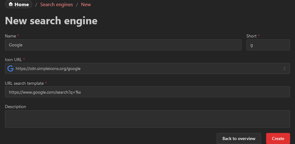 Prefix that is used to choose the search engine in the popover using the keyboard. It is recommended that this value is kept short (for example g for Google and e for Ecosia).